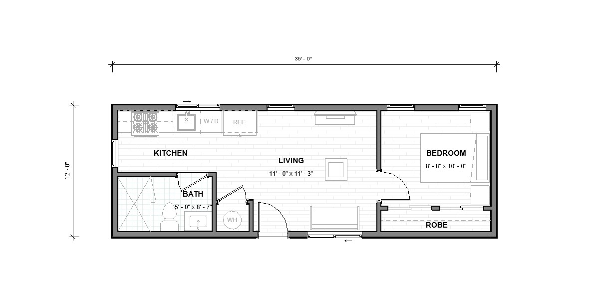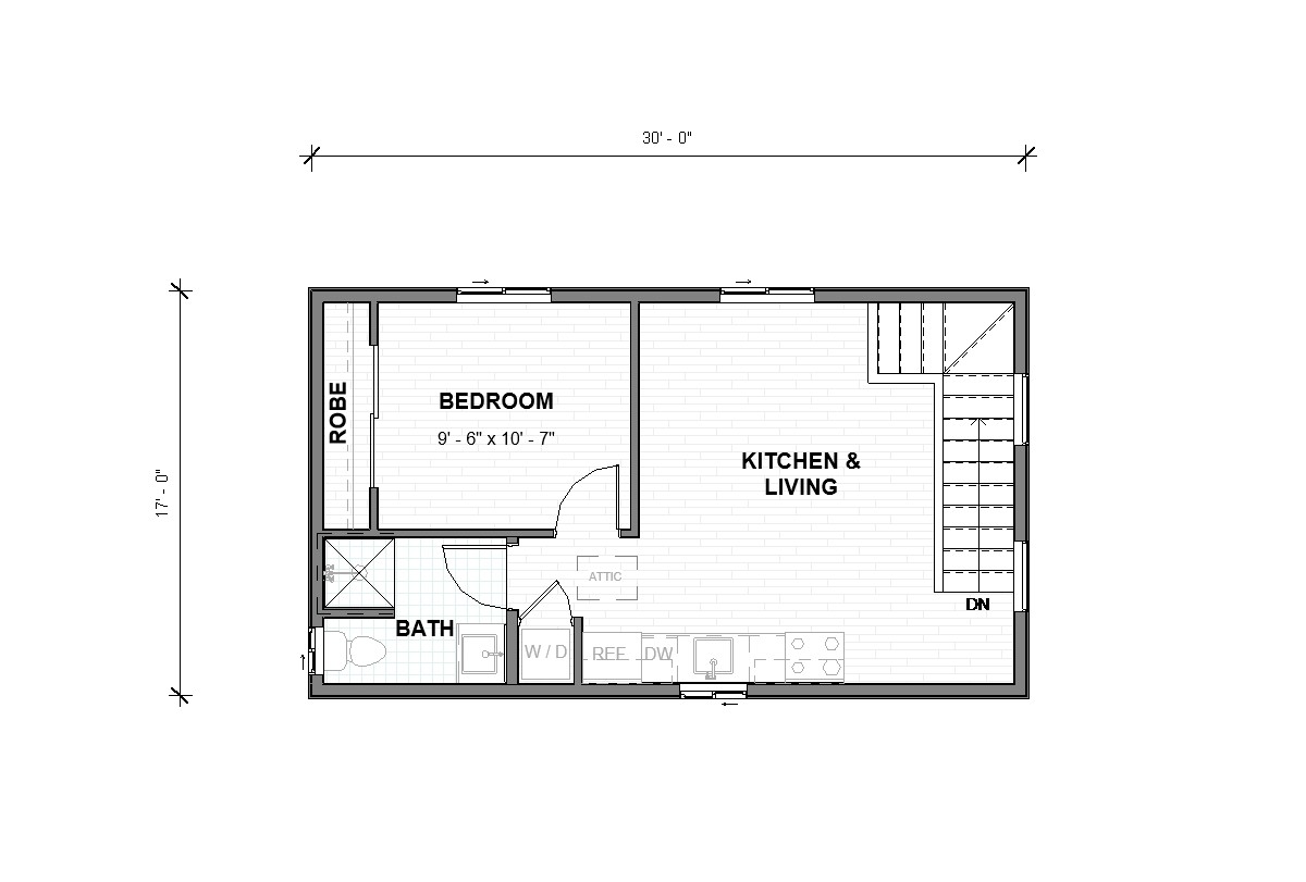 Compact studio ADU, perfect for minimalists, featuring an open layout with full kitchen and bath.